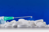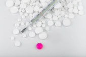 Masa białych tabletek z zielonym wstrzyknięciem i termometrem