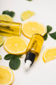 Widok z góry butelki olejku kosmetycznego z plastrami cytryny na białym tle