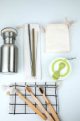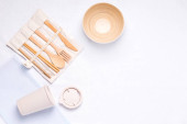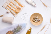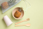 na białym stole znajdują się naczynia kuchenne wykonane z drewna oraz torba na zakupy z ananasem.