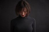 stylowe nowoczesne dziewczyny podróżnik blogger w czarnej kurtce. Portret młodej pięknej dziewczyny na otwartej przestrzeni wśród puszystej trawy. Patrzy w dal.