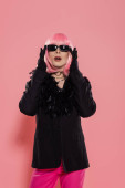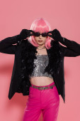stylowa dziewczyna w garniturze, okulary przeciwsłoneczne i różowa peruka pozowanie w podartym papierze, izolowane na białym