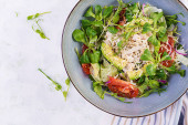 Zdjęcie "Świeże pomidory sałatkowe, awokado, sałatka kukurydziana, nasiona szałwii i parmezan." może być wykorzystywane do celów osobistych i komercyjnych zgodnie z warunkami zakupionej licencji Royalty-free. Obraz jest dostępny do pobrania w jakości wysokiej rozdzielczości do 5760x3840.
