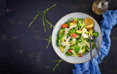 Zdjęcie "Świeża sałatka pomidorowa, awokado, sałatka kukurydziana, nasiona szałwii i parmezan. Koncepcja zdrowej żywności. Kuchnia wegetariańska. Dietetyczne jedzenie. Widok z góry, nad głową" może być wykorzystywane do celów osobistych i komercyjnych zgodnie z warunkami zakupionej licencji Royalty-free. Obraz jest dostępny do pobrania w jakości wysokiej rozdzielczości do 5760x3840.