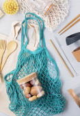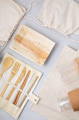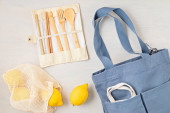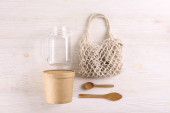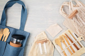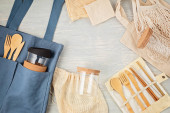 Zero odpadów. Zestaw ekologicznych bambusowych sztućców, siatkowa bawełniana torba, kubek do kawy wielokrotnego użytku i butelka wody. Zrównoważony, etyczny, wolny od tworzyw sztucznych styl życia.