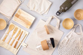 Zdjęcie "Zero odpadów. Zestaw ekologicznych bambusowych sztućców, siatkowa bawełniana torba, kubek do kawy wielokrotnego użytku i butelka wody. Zrównoważony, etyczny, wolny od tworzyw sztucznych styl życia. " może być wykorzystywane do celów osobistych i komercyjnych zgodnie z warunkami zakupionej licencji Royalty-free. Obraz jest dostępny do pobrania w jakości wysokiej rozdzielczości do 5760x3840.
