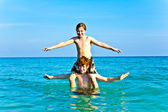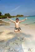 szczęśliwy chłopiec skacze w powietrzu nad oceanem