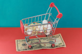 mały wózek sklepowy z torbą dolarową i zabawką na niebiesko, koncepcja leasingu