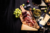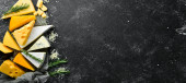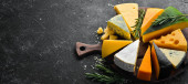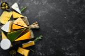 Ser. Asortyment serów i przekąsek na czarnym kamiennym tle. Widok góry. Wolne miejsce na tekst.