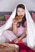 Poranek niezadowolonej młodej kobiety jedzącej smaczną pizzę oglądając telewizję w sypialni