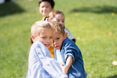 uśmiechnięty i uroczy chłopiec siedzi na trawie odizolowany na białym