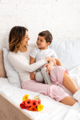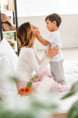 uśmiechnięta matka i syn trzymający hawańskiego szczeniaka odizolowanego na białym