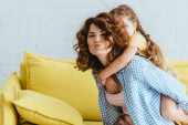 uśmiechnięta matka z Havanese szczeniak patrząc na syna odizolowanego na białym