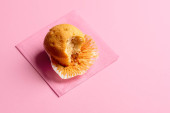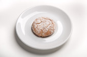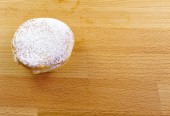 Jeden pączek na niebieskich talerzach. Niemiecki pączek z cukrem pudrem