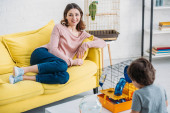 matka i syn siedzący na fotelu z hawańskim szczeniakiem odizolowanym na białym
