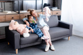 matka z Havanese szczeniak siedzi na trawie i syn siedzi na fotelu odizolowany na białym