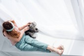 kobieta siedzi na trawie i patrząc na Havanese szczeniak izolowany na białym