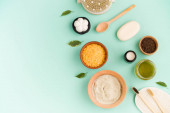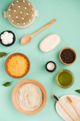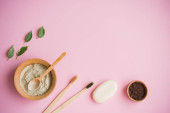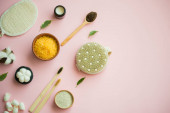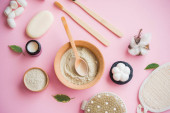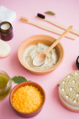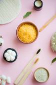 Sól do kąpieli kosmetycznej, gomaj winogronowy na twarz, peeling do kawy dla ciała na różowym tle.