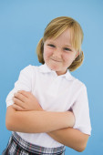 Chłopak sobie strój superbohatera z ramionami skrzyżowanymi