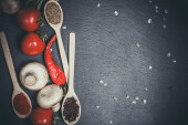 Różne przyprawy w drewnianych łyżeczkach i różnych składnikach do gotowania, pomidory wiśniowe, czosnek, kolendra i pieprz czerwony