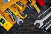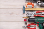 Narzędzia w warsztacie. Na stole znajdują się narzędzia do różnego rodzaju prac budowlanych i remontowych na drewnie, metalu, betonie, tworzywach sztucznych i innych materiałach.