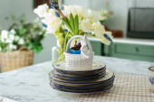 Zdjęcie "Przybory kuchenne, koncepcja kuchni wystroju wnętrz. Nowoczesna kuchnia z naczyniami do gotowania i czyste naczynia. Narzędzia kuchenne, deski do krojenia na stole o ścianę z białej cegły. Jadalnia w środku. rustykalny " może być wykorzystywane do celów osobistych i komercyjnych zgodnie z warunkami zakupionej licencji Royalty-free. Obraz jest dostępny do pobrania w jakości wysokiej rozdzielczości do 5760x3840.