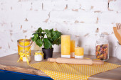 różne naczynia kuchenne na drewnianym stole. koncepcja kuchni wystroju domu. Narzędzia kuchenne, świece i drewniany wałek do toczenia pod białą ceglaną ścianą. Słoik z kolorowym makaronem. Wiosenny wystrój kuchni. Pascha