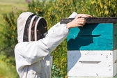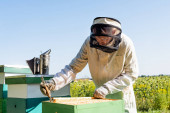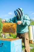 mężczyzna pszczelarz prowadzenie polu plaster miodu w pasieki