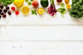 zdrowe surowe warzywa organiczne z ziołami i kiełki z owoców na białym drewnianym stole. Świeży ogród wegetariańska koncepcja żywności