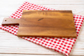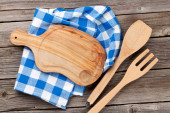 Deska do krojenia i drewniane sztućce na ręczniku herbaty zbliżenie na białym tle
