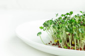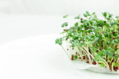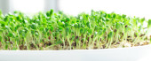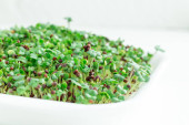 Sałatka na parapecie. Mikrowarzywa rosną. Wegańskie i zdrowe jedzenie koncepcja. Białe tło. Zbliżenie