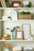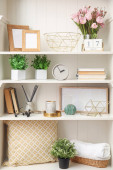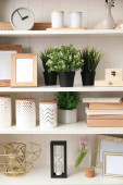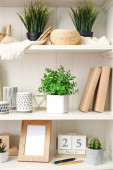 Biała półka z roślinami i różnymi dodatkami dekoracyjnymi