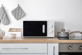 Zdjęcie "Nowoczesny kuchenka mikrofalowa w kuchni" może być wykorzystywane do celów osobistych i komercyjnych zgodnie z warunkami zakupionej licencji Royalty-free. Obraz jest dostępny do pobrania w jakości wysokiej rozdzielczości do 5760x3840.