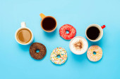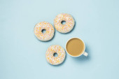 Pączki latające w powietrzu i filiżanka papieru do kawy na niebieskim tle. Piekarnia, koncepcja pieczenia. Lewitacja. Sztandar