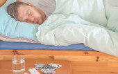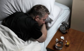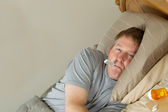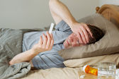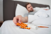 człowiek próbuje znaleźć jego medycyna leżąc w łóżku