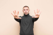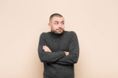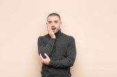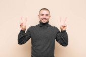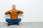 Zdjęcie "młody przystojny mężczyzna uśmiechnięty, czujący się beztrosko, zrelaksowany i szczęśliwy, tańczący i słuchający muzyki, bawiący się na imprezie pod płaską ścianą" może być wykorzystywane do celów osobistych i komercyjnych zgodnie z warunkami zakupionej licencji Royalty-free. Obraz jest dostępny do pobrania w jakości wysokiej rozdzielczości do 5760x3840.