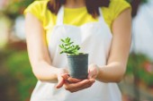 Samice w rękawiczkach trzymające młode kiełki w drewnianym pudełku