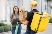 Zdjęcie "Atrakcyjny kurier uśmiechnięty do kamery i dający paczkę świeżych warzyw człowiekowi w domu" może być wykorzystywane do celów osobistych i komercyjnych zgodnie z warunkami zakupionej licencji Royalty-free. Obraz jest dostępny do pobrania w jakości wysokiej rozdzielczości do 5760x3840.