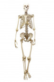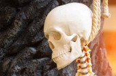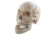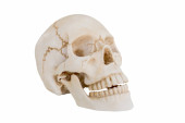 Ludzka głowa czaszki na szyi kręgosłupa odizolowana na białym tle.