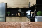 Zdjęcie "Pusty drewniany stół w pięknej kuchni. Projekt wnętrza" może być wykorzystywane do celów osobistych i komercyjnych zgodnie z warunkami zakupionej licencji Royalty-free. Obraz jest dostępny do pobrania w jakości wysokiej rozdzielczości do 5760x3840.