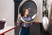 Dziewczyna ładuje pranie do pralki. kobieta w publicznej pralni