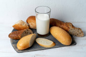 Zdjęcie "mini bagietki i mleko szklane na tle ściany z czarnego betonu. Odbiór. Przepis. Menu" może być wykorzystywane do celów osobistych i komercyjnych zgodnie z warunkami zakupionej licencji Royalty-free. Obraz jest dostępny do pobrania w jakości wysokiej rozdzielczości do 5760x3840.