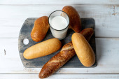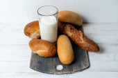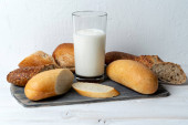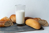 mini bagietki i mleko szklane na tle ściany z czarnego betonu. Odbiór. Przepis. Menu
