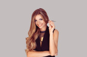 Młoda brunetka uśmiecha się, dotykając twarzy rękami, chcąc pokazać jej makijaż, lub nowy krem