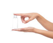 Zbliżenie portret młodej seksownej blondynki trzymającej butelki z ampułkami do wstrzykiwań na otwartej dłoni