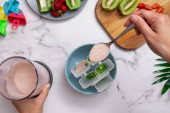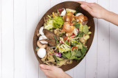 Sałatka pomidorowa i bazylia. Widok góry. Pojęcie żywności dietetycznej.