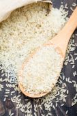 Biały ryż z drewnianą łyżką na stosie ryżu na tle starych desek. Ryż jaśminowy do gotowania.