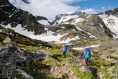 Widok latem Tatry (Słowacja) i rodziny na footway.