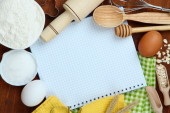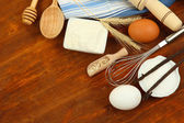 gotowania. podstawowych składników pieczenia i naczynia kuchenne na drewnianym stole