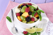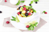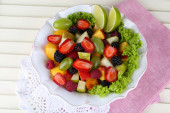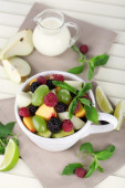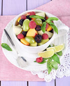 sałatka owocowa w Pucharze na serwetki na stół drewniany