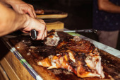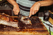 Zdjęcie "Domowej roboty grillowane dorado ryby z warzywami zawinięte w folię aluminiową na rustykalnym stole. Widok z góry." może być wykorzystywane do celów osobistych i komercyjnych zgodnie z warunkami zakupionej licencji Royalty-free. Obraz jest dostępny do pobrania w jakości wysokiej rozdzielczości do 5760x3840.